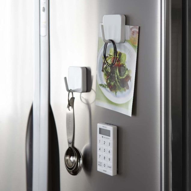 Acest cârlig se atașează ușor, prin magnet, de frigidere sau alte suprafețe metalice, oferind instantaneu un spațiu suplimentar pentru agățarea ustensilelor de bucătărie sau a altor obiecte din casă.