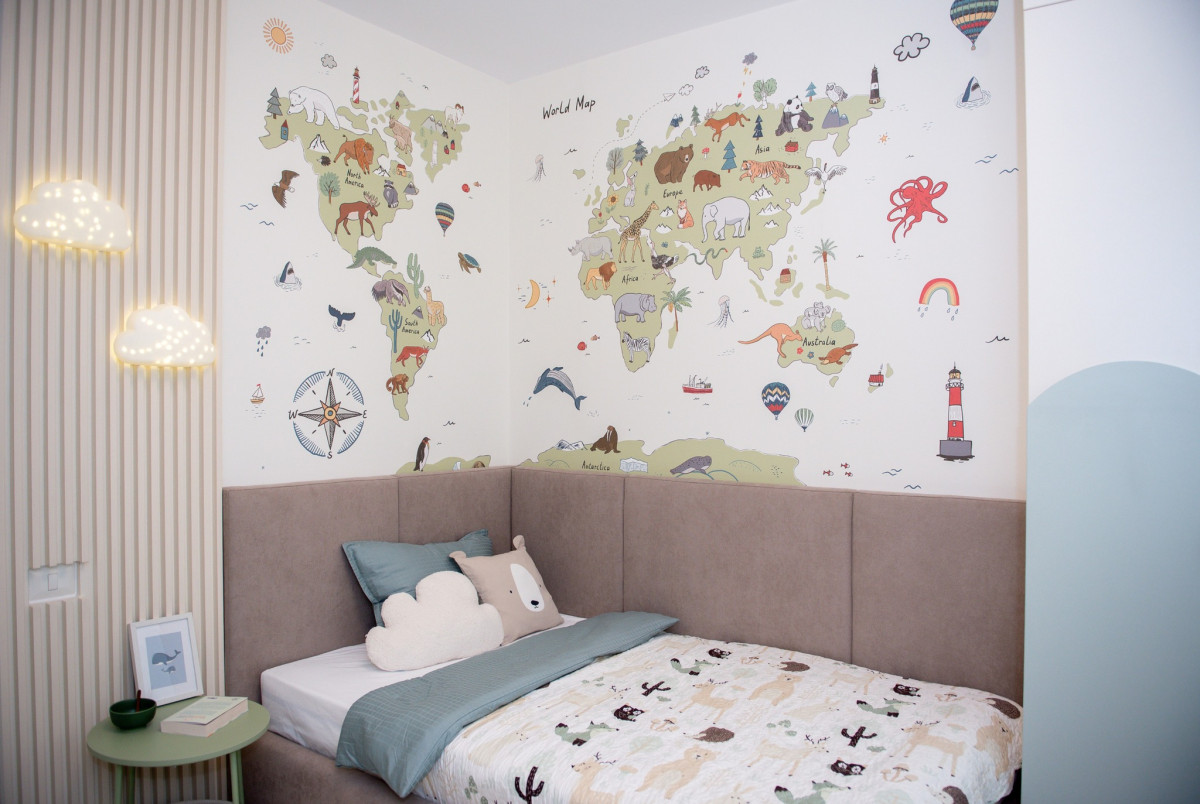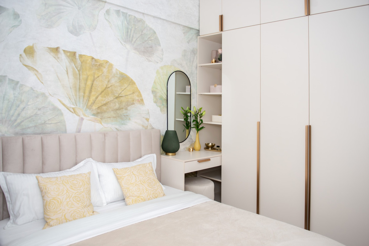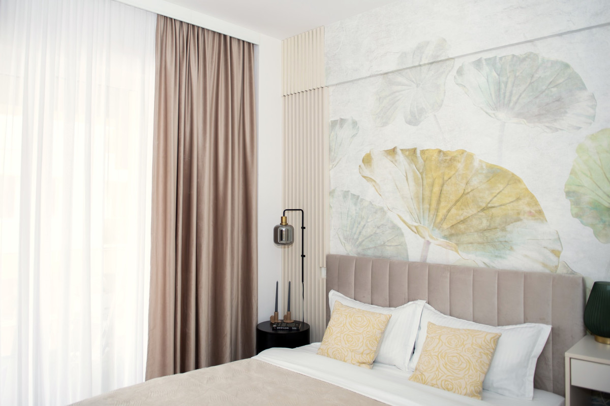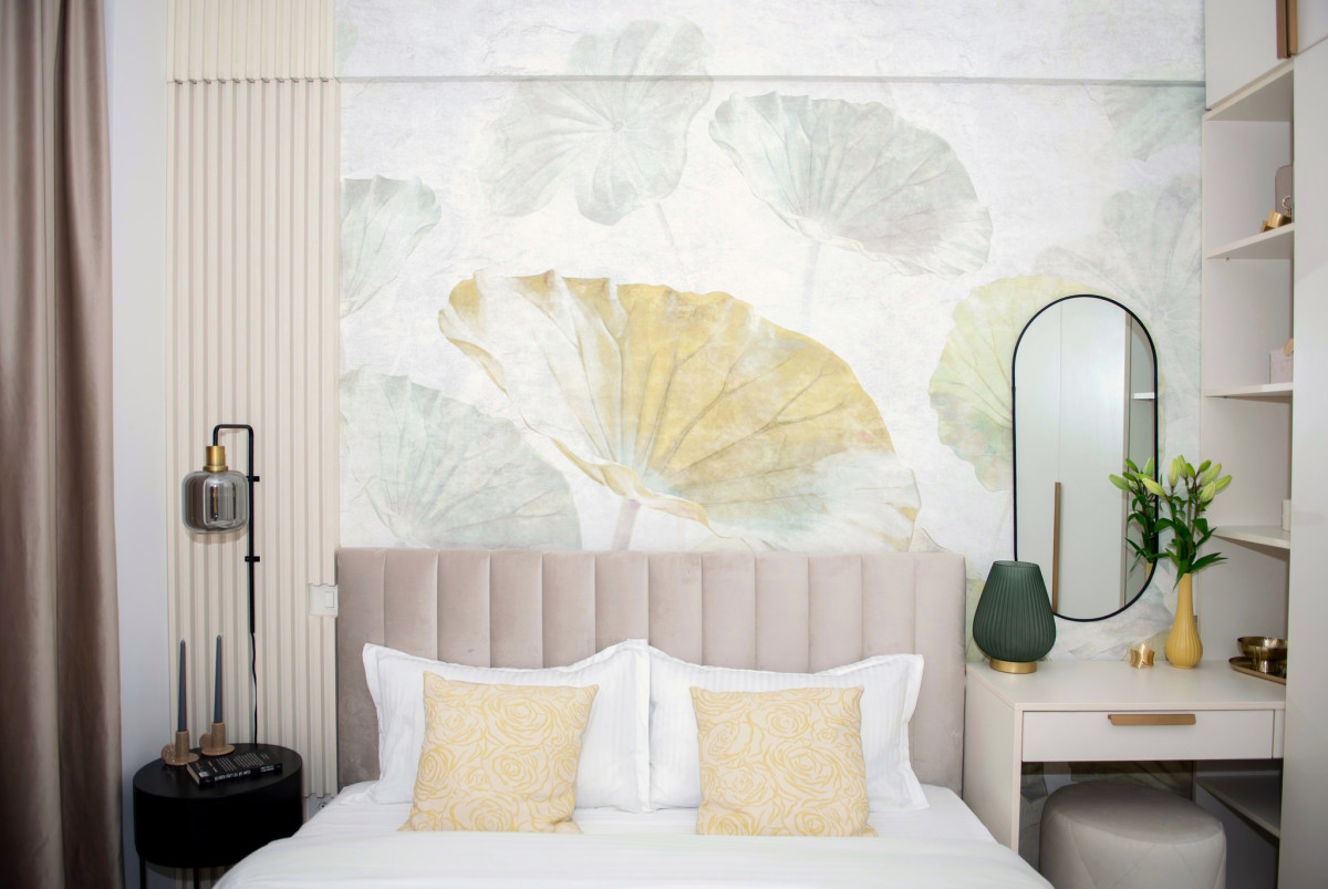 Piesa centrală care definește identitatea vizuală a dormitorului este tapetul decorativ "Waterlily" de la Rebel Walls, disponibil în oferta XT Deco. Acest finisaj spectaculos, cu nuferi supradimensionați în nuanțe delicate de verde și albastru, transformă peretele de la capul patului într-o fereastră către un lac liniștit, oferind profunzime și o notă artistică inconfundabilă. Loredana Juncu a ales acest model pentru a induce o stare de relaxare totală, completând decorul cu elemente personalizate (precum litere decorative din lemn) care adaugă o notă intimă și ludică spațiului. Îmbinarea dintre tapetul statement și texturile soft ale mobilierului creează un echilibru perfect între designul modern și confortul absolut.