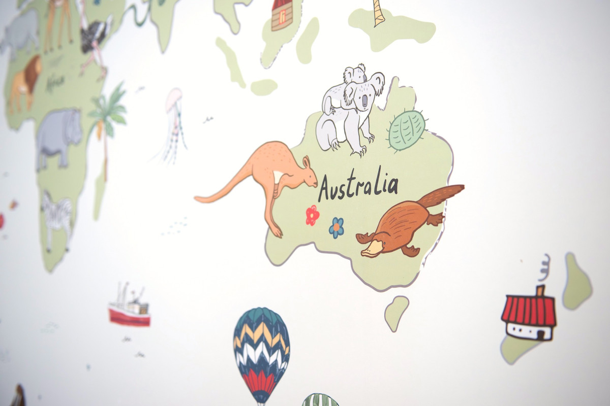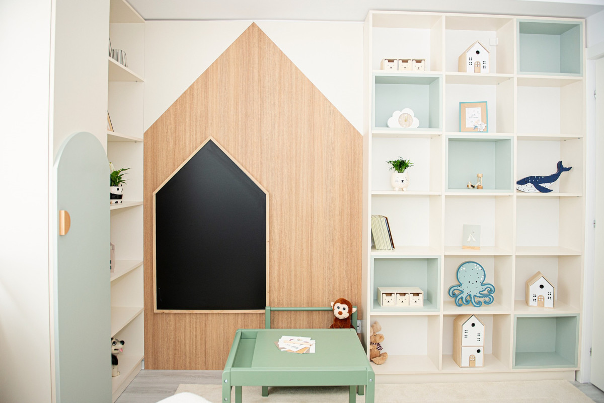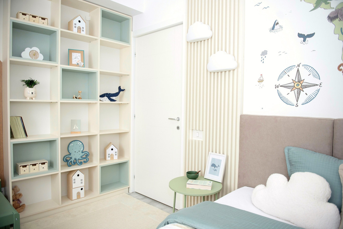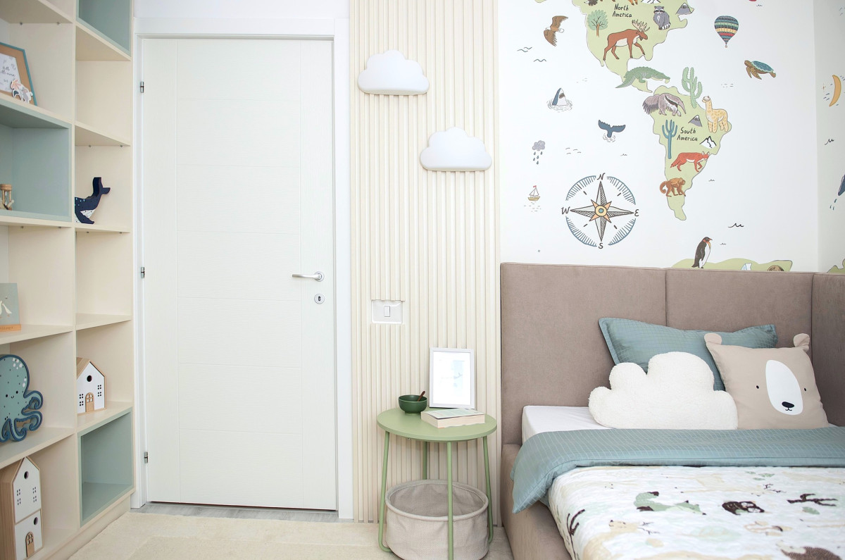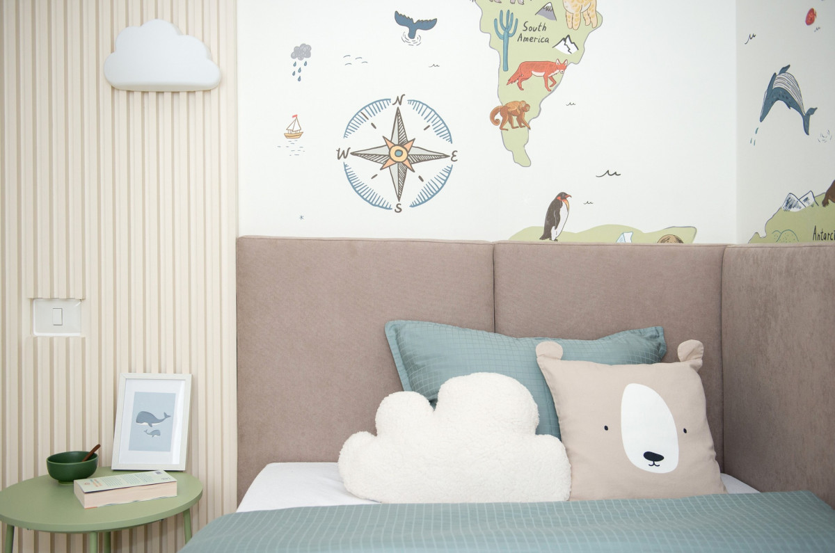 Piesa centrală care definește identitatea vizuală a dormitorului este tapetul decorativ "Waterlily" de la Rebel Walls, disponibil în oferta XT Deco. Acest finisaj spectaculos, cu nuferi supradimensionați în nuanțe delicate de verde și albastru, transformă peretele de la capul patului într-o fereastră către un lac liniștit, oferind profunzime și o notă artistică inconfundabilă. Loredana Juncu a ales acest model pentru a induce o stare de relaxare totală, completând decorul cu elemente personalizate (precum litere decorative din lemn) care adaugă o notă intimă și ludică spațiului. Îmbinarea dintre tapetul statement și texturile soft ale mobilierului creează un echilibru perfect între designul modern și confortul absolut.