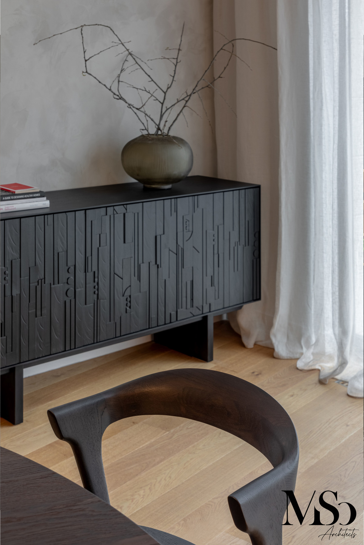 Pentru a contura această scenografie, finisajele XT Deco au fost alese cu grijă pentru a defini personalitatea fiecărei camere. În dormitor, tapetul Sakamoto (Grey) de la Tecnografica devine piesa de rezistență; inspirat de estetica japoneză, acesta induce o stare de zen prin formele sale organice și difuze, transformând peretele de la capătul patului într-un fundal de vis. În zona de zi, eleganța este ridicată la un nou nivel prin tapetele Londonart. Modelul Layers Re-Edition, cu geometriile sale minimaliste și liniile fine aurii, adaugă o notă glam discretă, structurând spațiul, în timp ce textura subtilă a modelului L.I.V. îmbracă pereții într-un strat de rafinament tactil, evitând monotonia vopselei lavabile simple.
