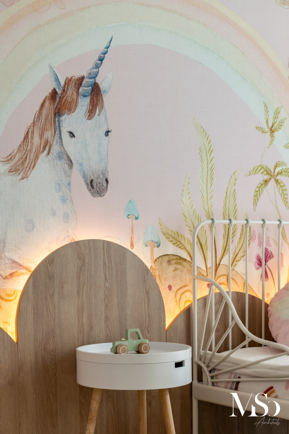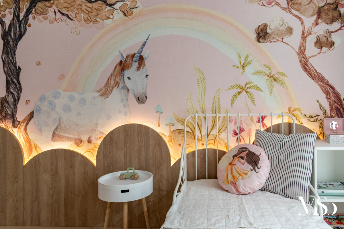 Piesa centrală a acestei atmosfere de basm este, fără îndoială, tapetul Unicorn Dream (Rainbow) de la Rebel Walls, furnizat de XT Deco. Acest finisaj nu doar decorează, ci spune o poveste: unicorni, copaci fantastici și curcubee se împletesc într-un desen delicat, transformând peretele într-o fereastră către o lume magică. Nuanțele pastelate și ilustrația artistică oferă camerei o profunzime caldă, creând un fundal perfect pentru joacă și odihnă, demonstrând cum un singur perete accent poate schimba complet vibrația unei încăperi.