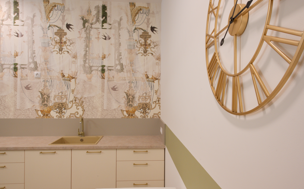 Elementul vizual care transformă complet experiența spațiului este tapetul "Marble Wings", semnat de brandul românesc VLAdiLA, partener XT Deco. Aplicat strategic, acest finisaj funcționează ca o piesă de artă murală, îmbinând texturi fluide care amintesc de marmură cu inserții florale delicate și elemente aurii subtile. Designul său diafan reduce anxietatea specifică sălilor de așteptare sau cabinetelor, oferind privirii un punct de sprijin relaxant.