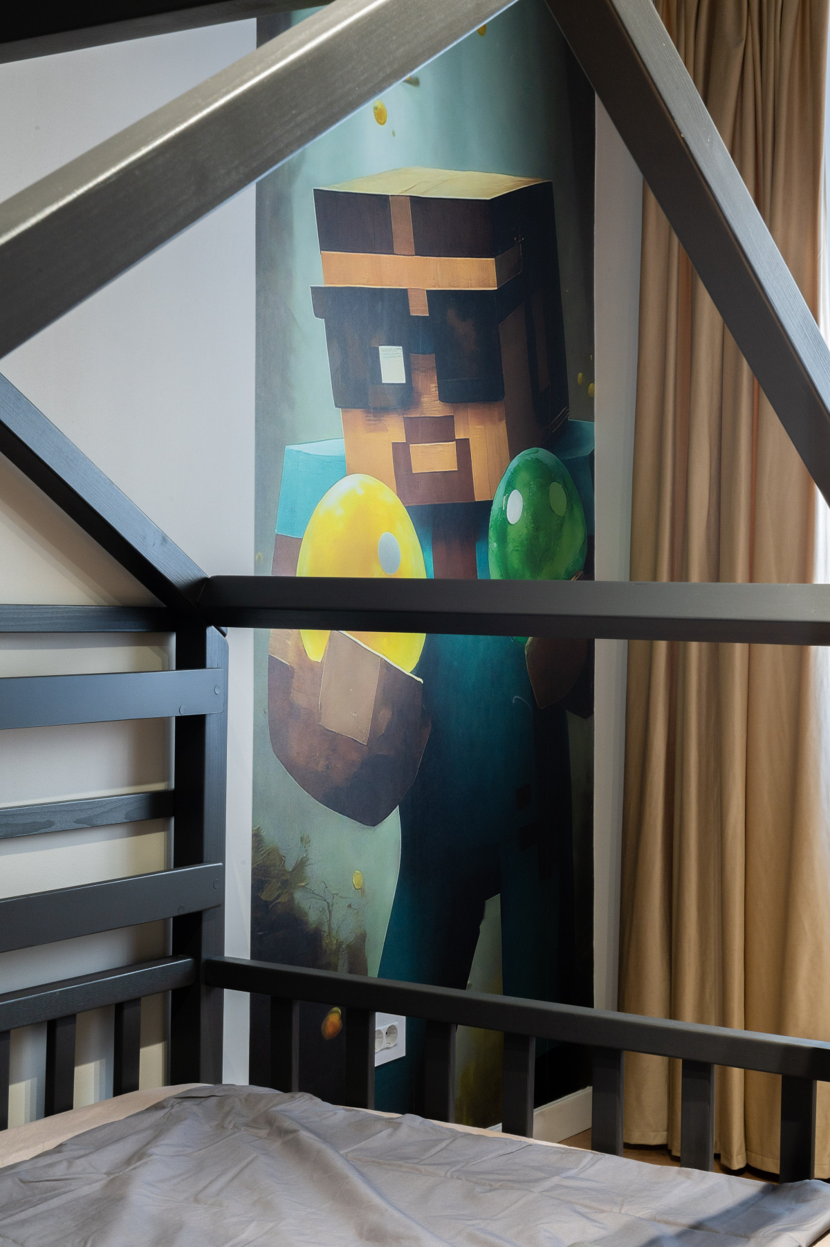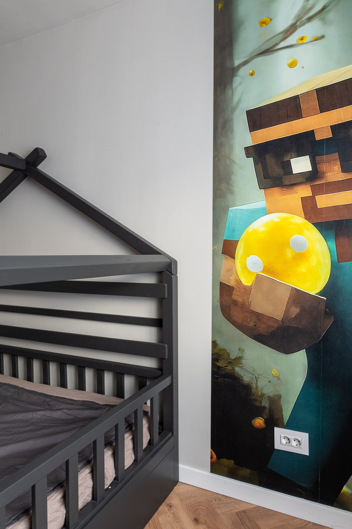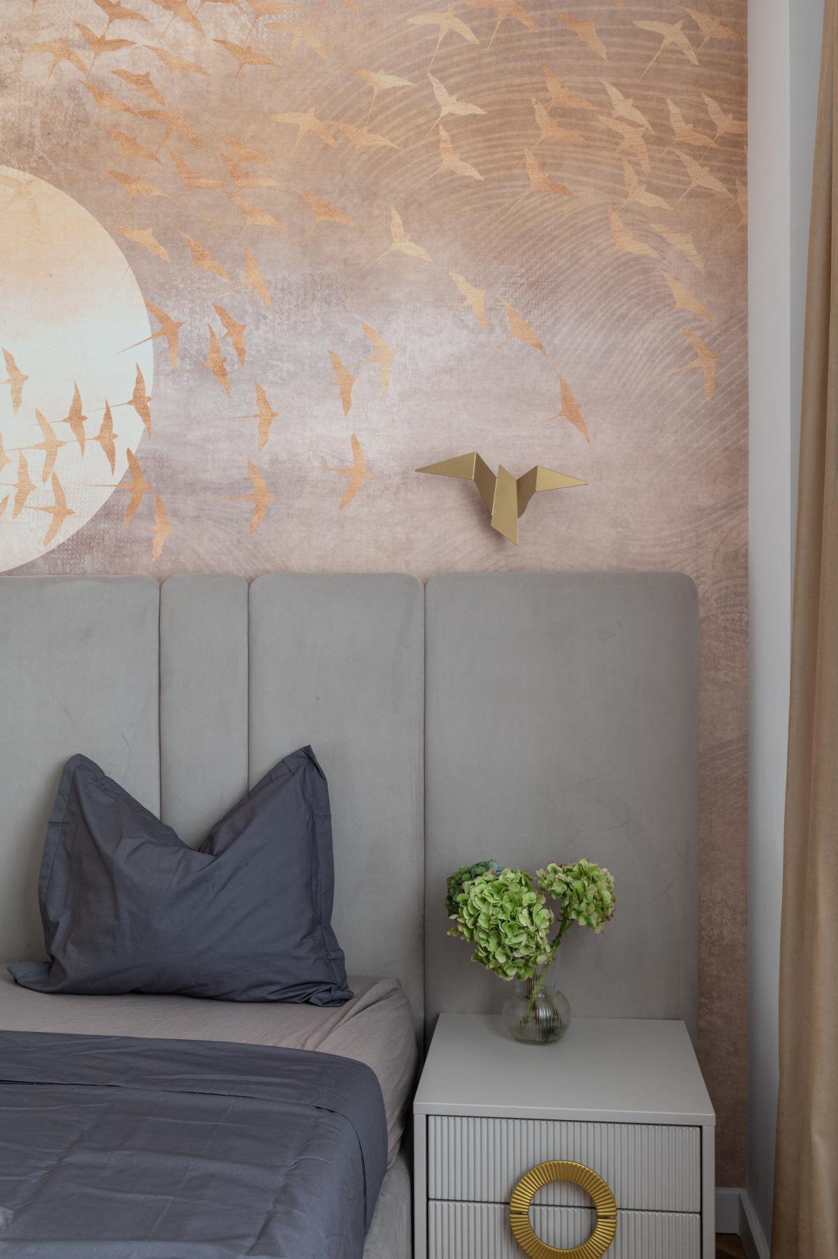 • Accentele de lux sunt date de tapetul Glamora – Aurea, un model spectaculos ce surprinde un apus stilizat cu păsări aurii. Acesta transformă peretele într-o operă de artă, reflectând lumina și oferind profunzime camerei.