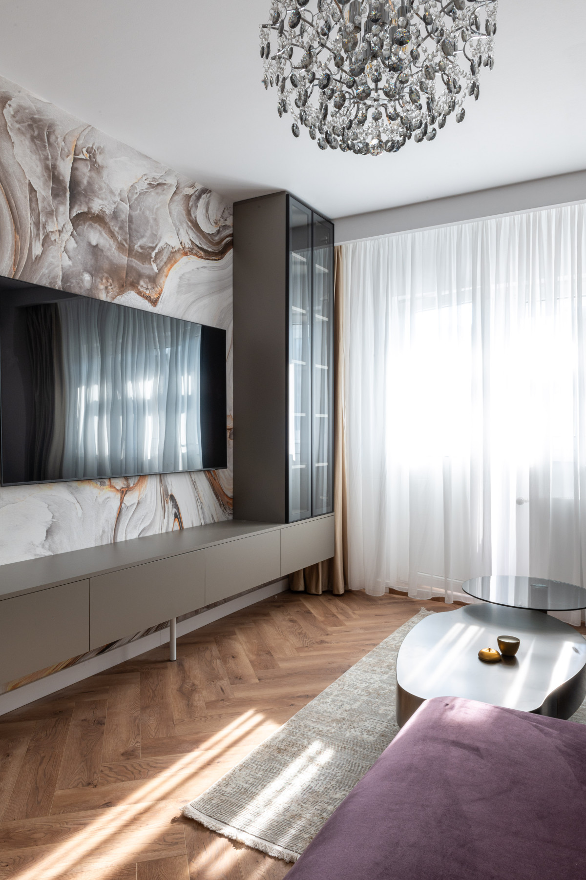 • Punctul focal al zonei de zi a fost creat cu ajutorul tapetului Rebel Walls – Marble Swirl Nougat. Cu nuanțele sale de maro și bej care imită marmura în mișcare, acesta adaugă o notă de fluiditate și căldură organică spațiului, eliminând rigiditatea liniilor drepte ale mobilierului.