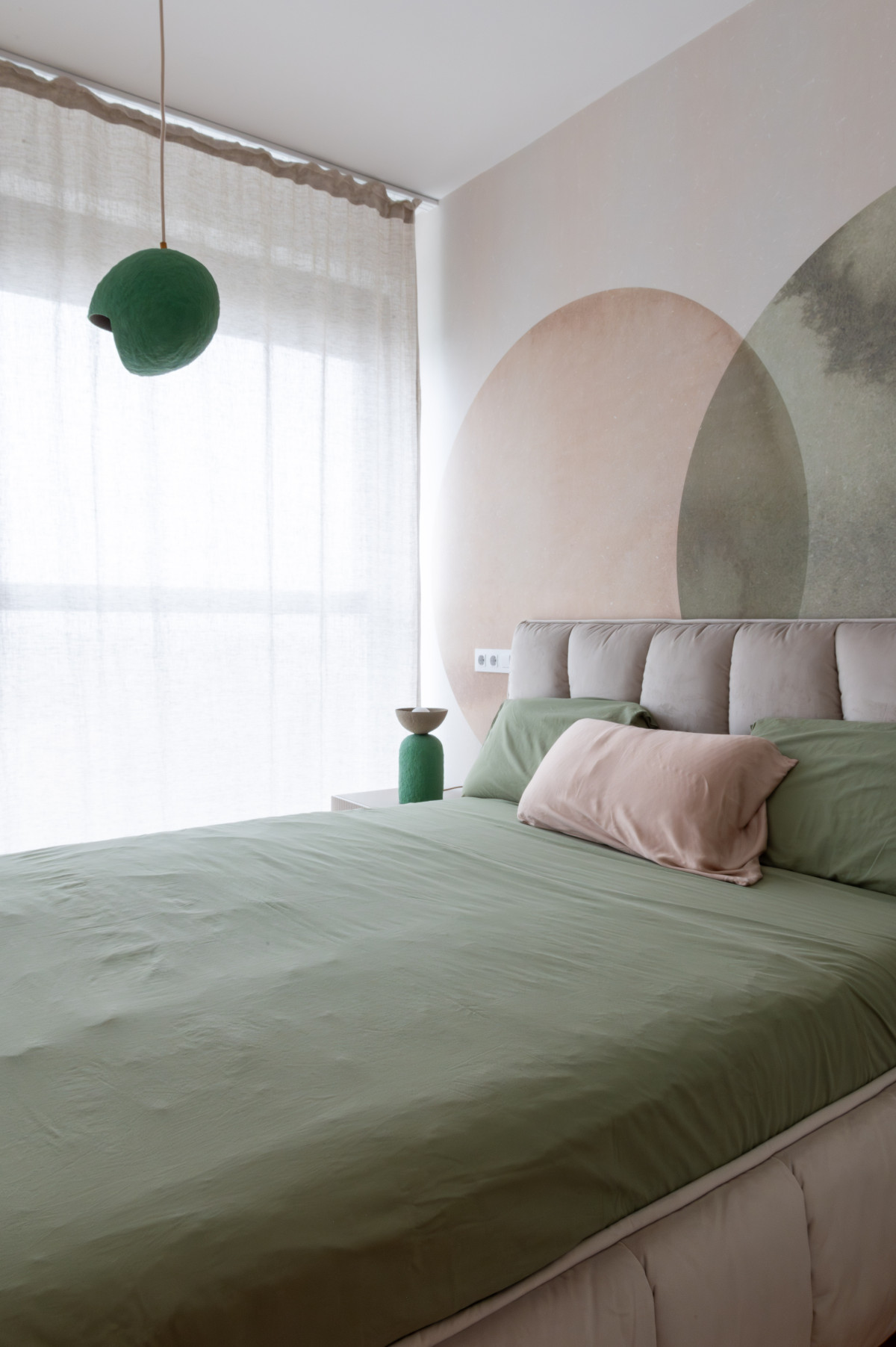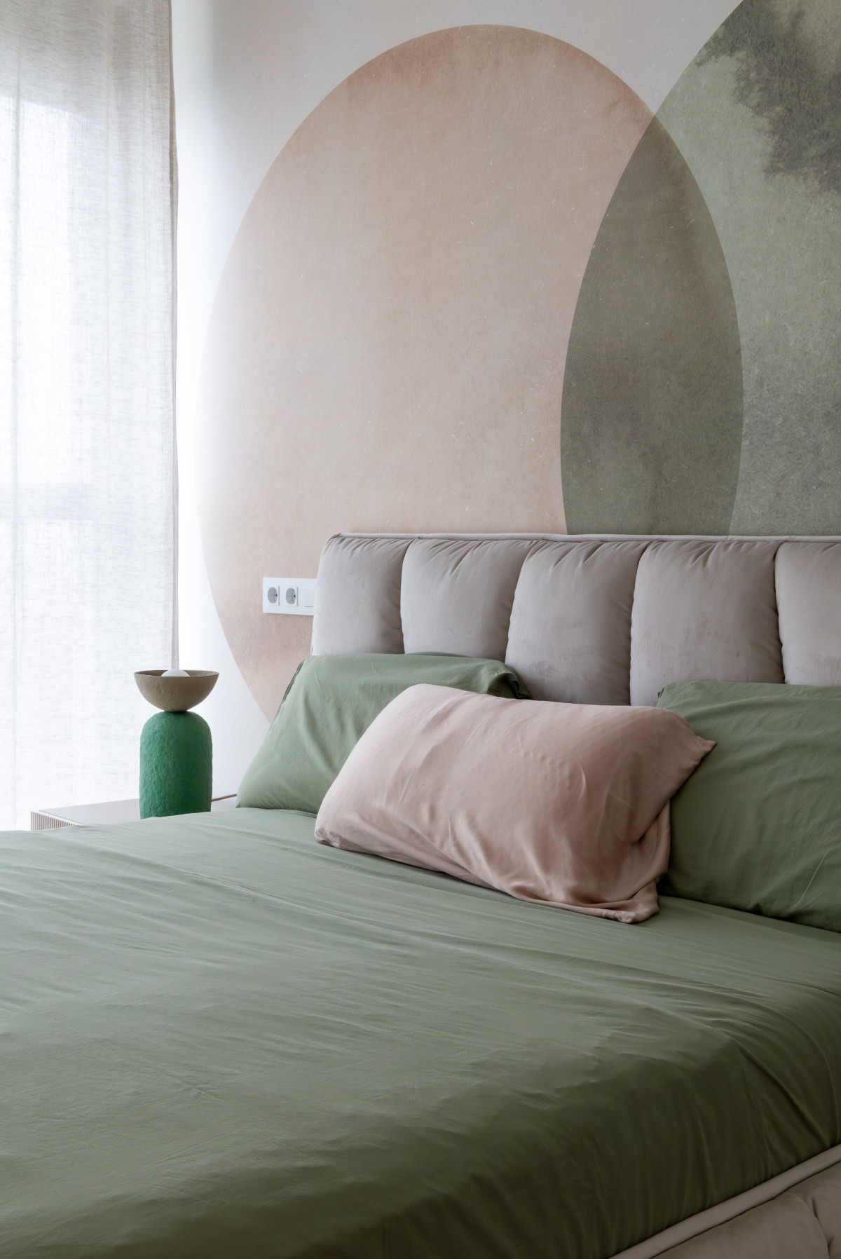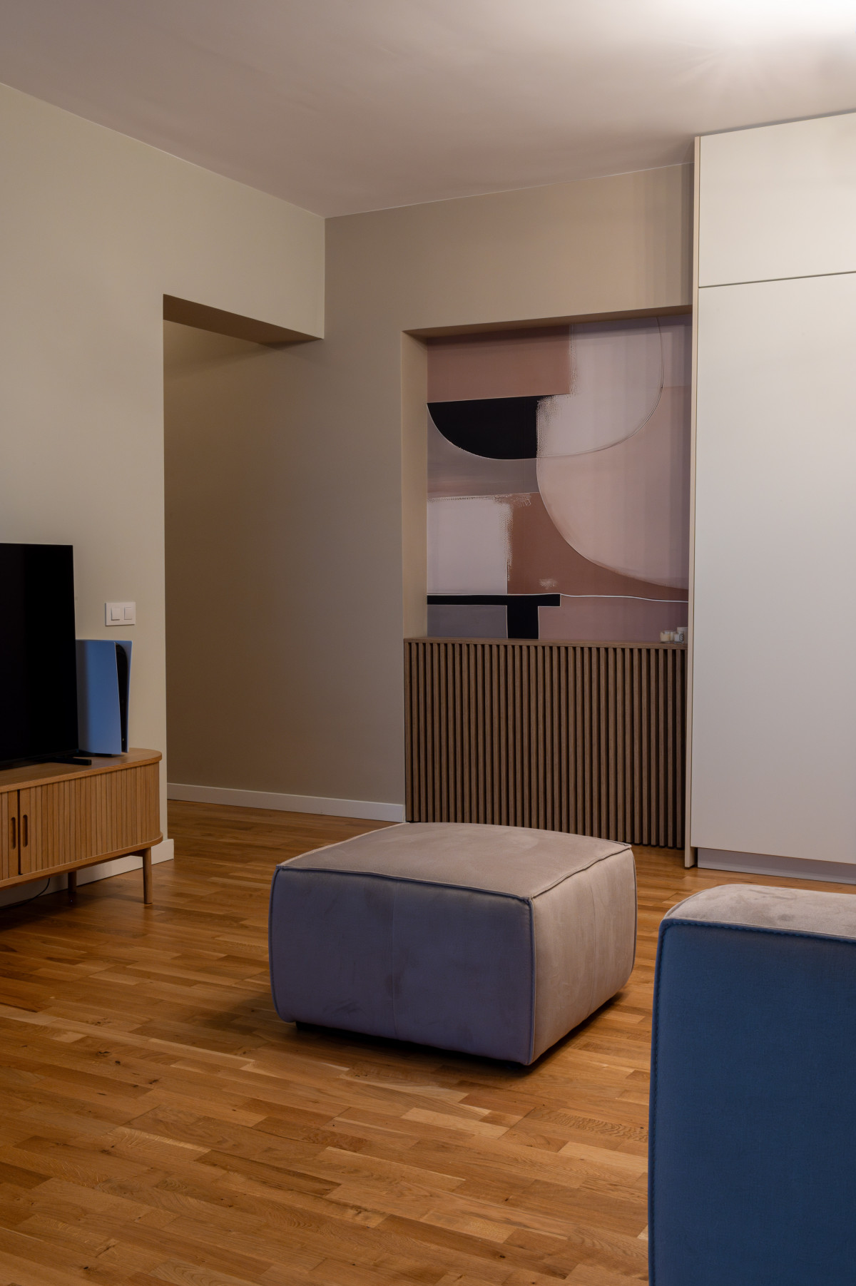Selecția de finisaje XT Deco a fost instrumentală în crearea acestor puncte focale. În dormitor, tapetul Eclipse - Beige Green de la Rebel Walls introduce o geometrie fluidă, cercurile suprapuse în nuanțe pământii și vegetale inducând o stare de calm și relaxare, perfectă pentru zona de odihnă. Contrastând cu această zonă, livingul prinde viață datorită modelului Abstract Shapes - Burgundy (tot Rebel Walls). Aici, formele organice și tonurile profunde de vișiniu și teracotă adaugă dinamism și căldură, transformând peretele într-o piesă de artă statement care ancorează întreaga amenajare.