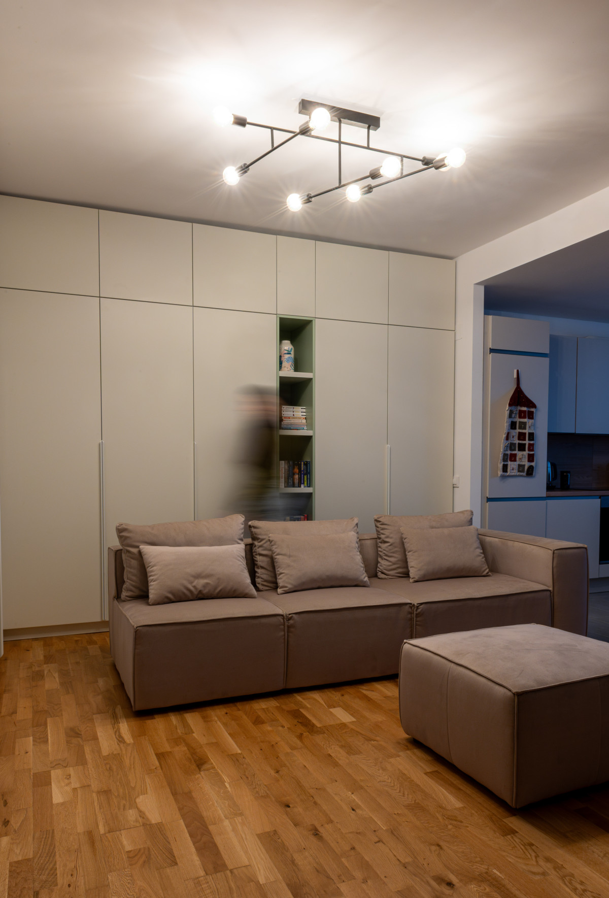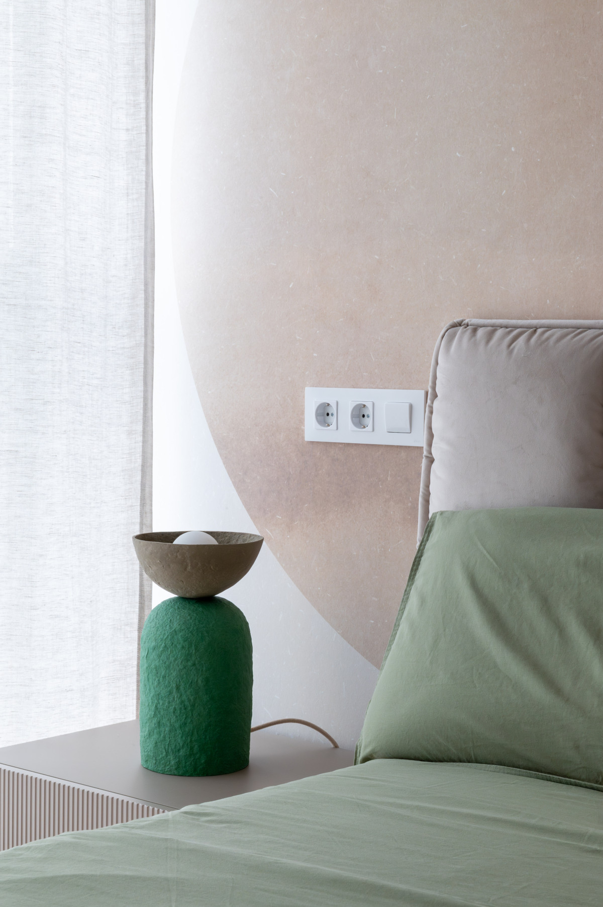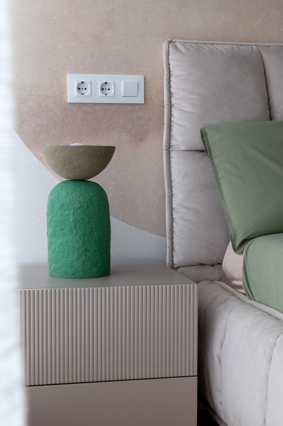 Selecția de finisaje XT Deco a fost instrumentală în crearea acestor puncte focale. În dormitor, tapetul Eclipse - Beige Green de la Rebel Walls introduce o geometrie fluidă, cercurile suprapuse în nuanțe pământii și vegetale inducând o stare de calm și relaxare, perfectă pentru zona de odihnă. Contrastând cu această zonă, livingul prinde viață datorită modelului Abstract Shapes - Burgundy (tot Rebel Walls). Aici, formele organice și tonurile profunde de vișiniu și teracotă adaugă dinamism și căldură, transformând peretele într-o piesă de artă statement care ancorează întreaga amenajare.