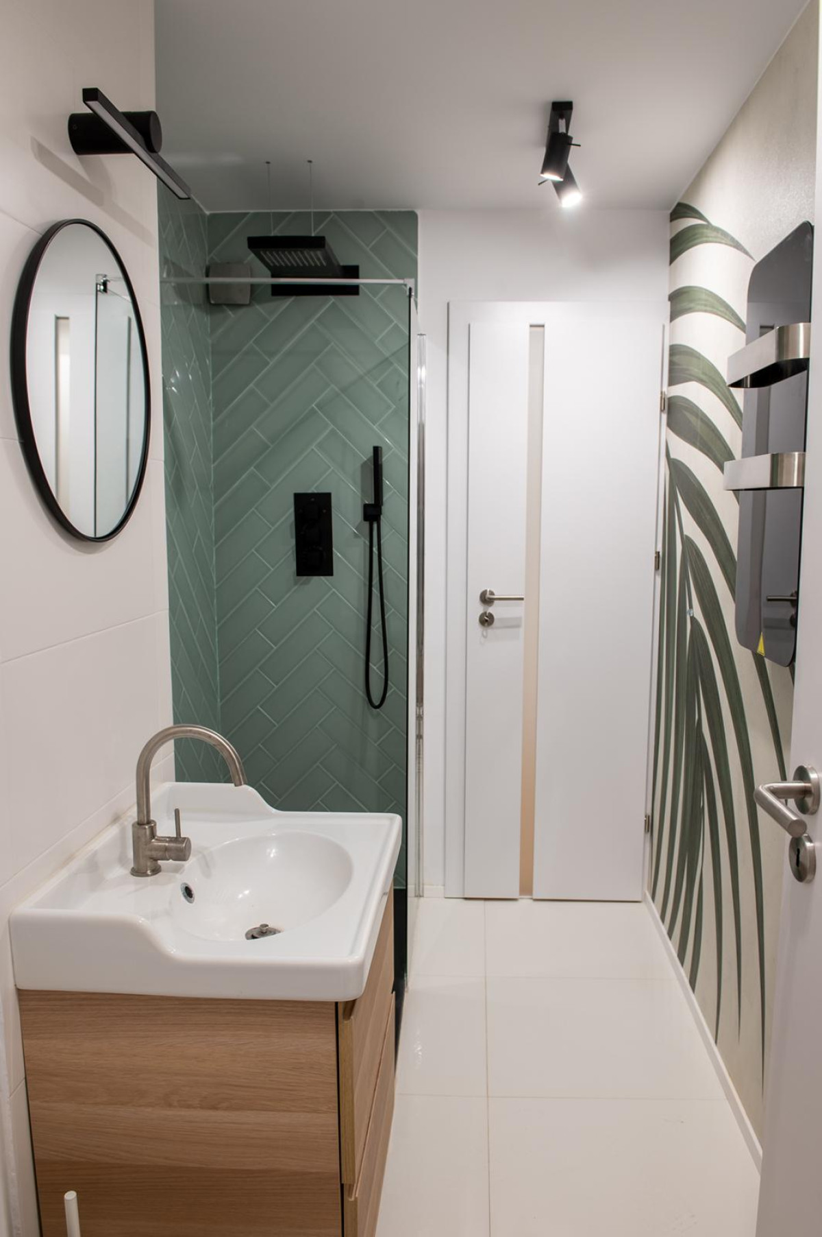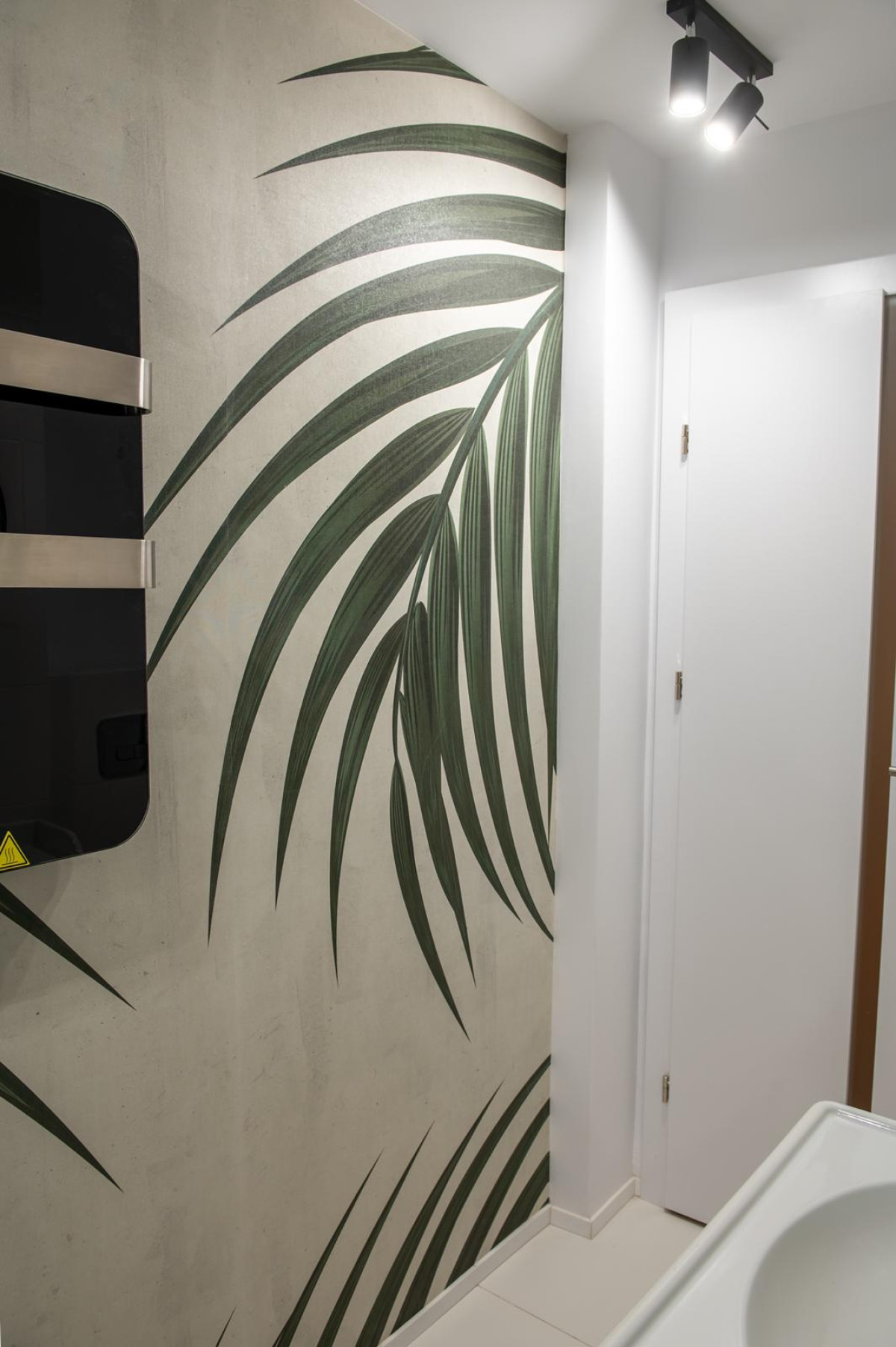 Baie: Pentru a crea o oază de relaxare neașteptată, s-a optat pentru tapetul VLAdiLA – Gentle Leaves. Modelul cu frunze de palmier transformă baia într-o mică seră tropicală. Fiind un tapet special (probabil pe suport de fibră de sticlă / rezistent la umiditate, specific zonelor umede), acesta aduce prospețimea naturii într-un spațiu convențional placat de obicei doar cu ceramică.