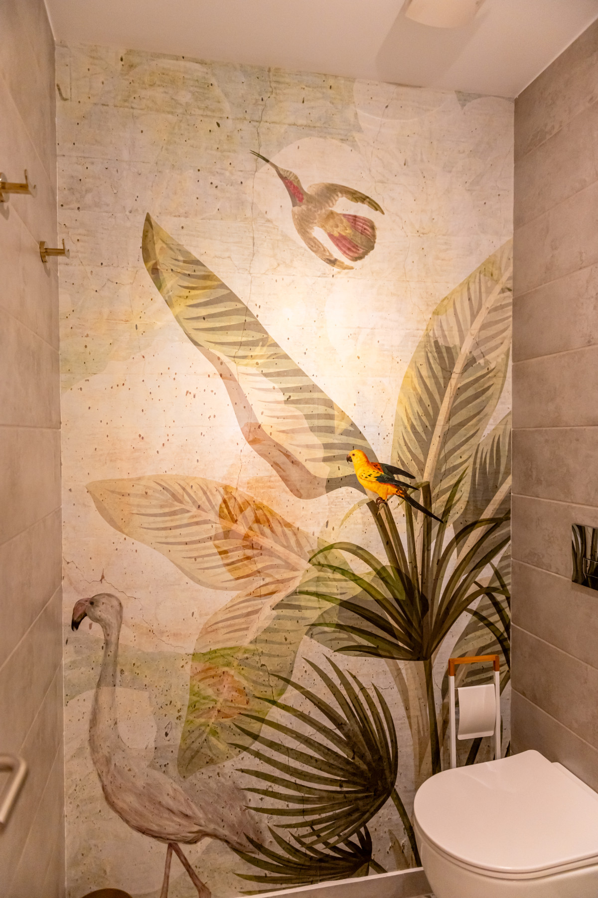 Piesă de Rezistență (Tapet): Vedeta amenajării este tapetul "Bright Sensation" de la brandul românesc VLAdiLA. Cu un design spectaculos ce ilustrează păsări tropicale și vegetație luxuriantă pe un fundal delicat, acesta aduce o explozie de energie și culoare în încăpere. Este alegerea perfectă pentru a sparge monotonia și a crea o atmosferă de vacanță perpetuă.