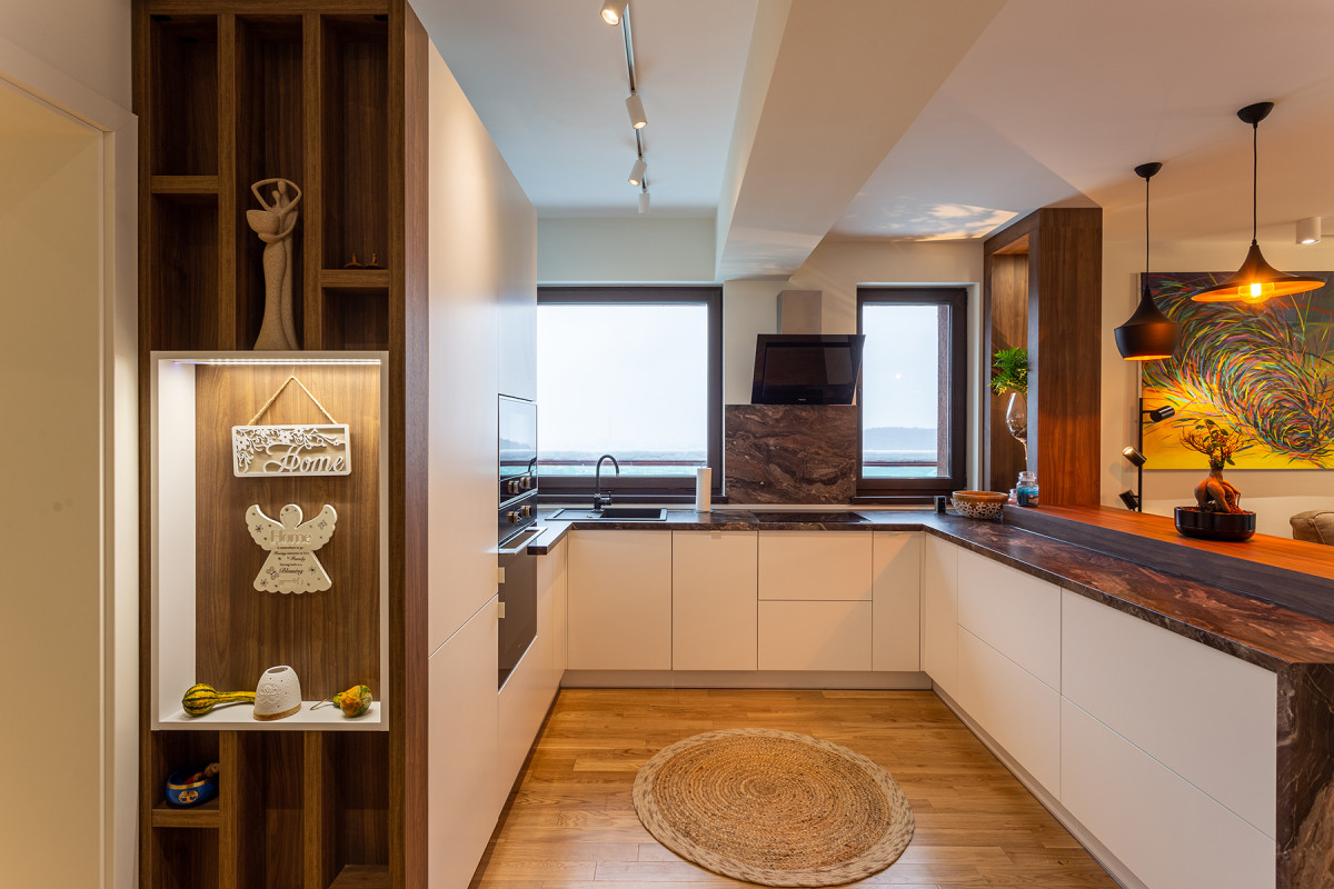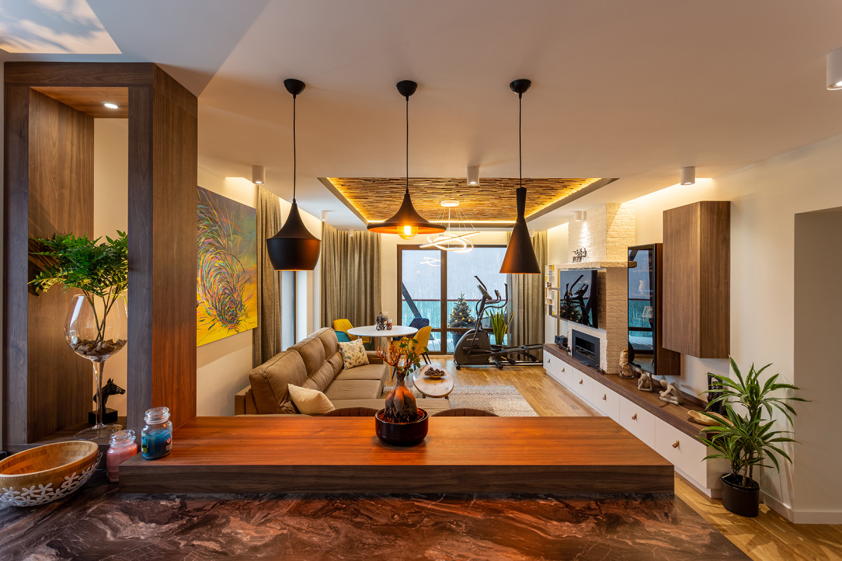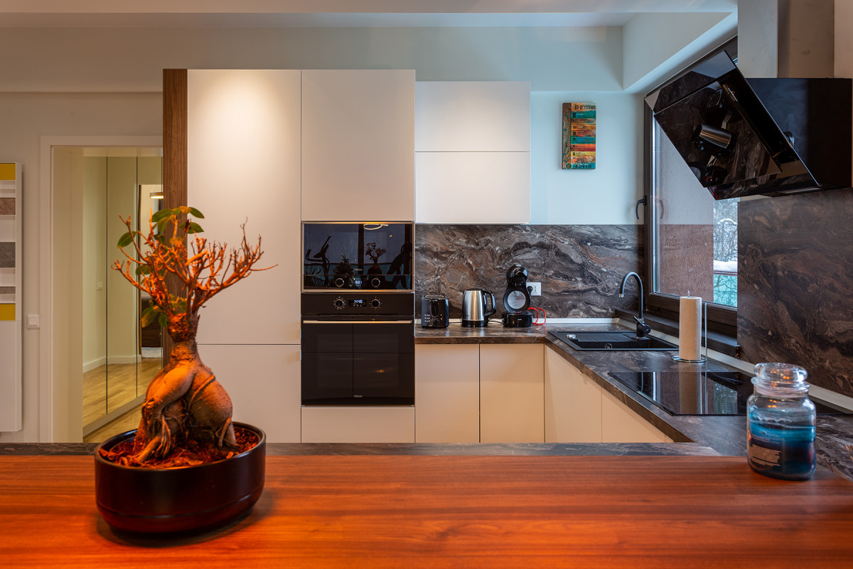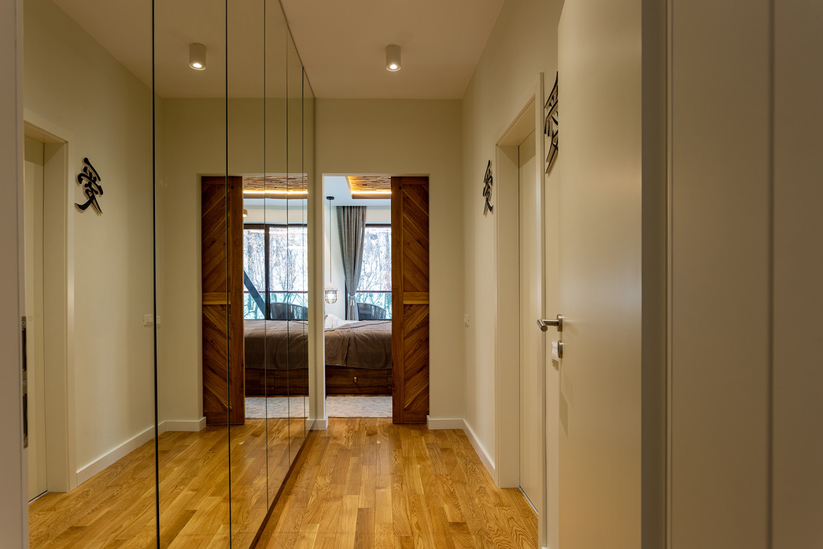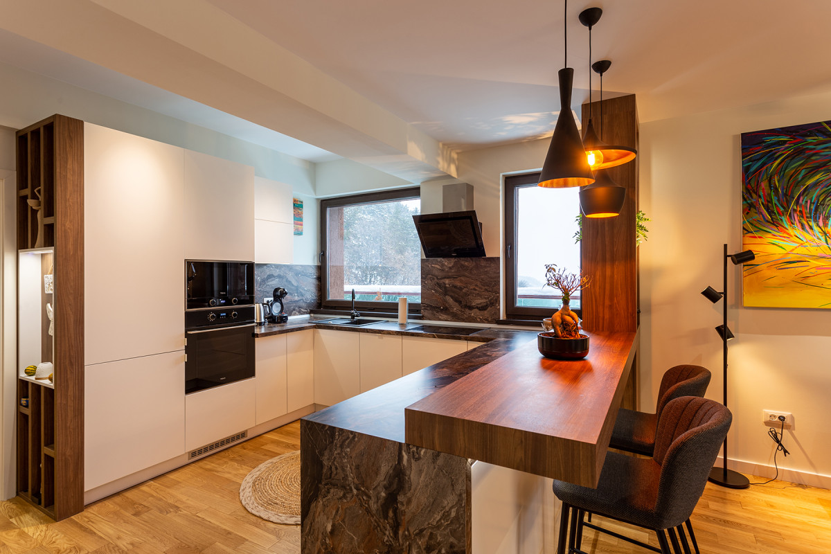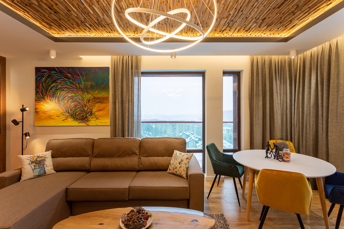 Amenajarea unui apartament din Brasov, cu o priveliste superba spre padure si oras. Un design simplu, elegant, de impact. Apartamentul dispune de un open space cu bucatarie si living, dormitor matrimonial cu zona de dressing si baie, un dormitor transformat in spatiu de lucru si birou, o baie de serviciu, hol si doua camari.